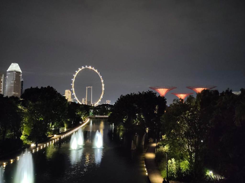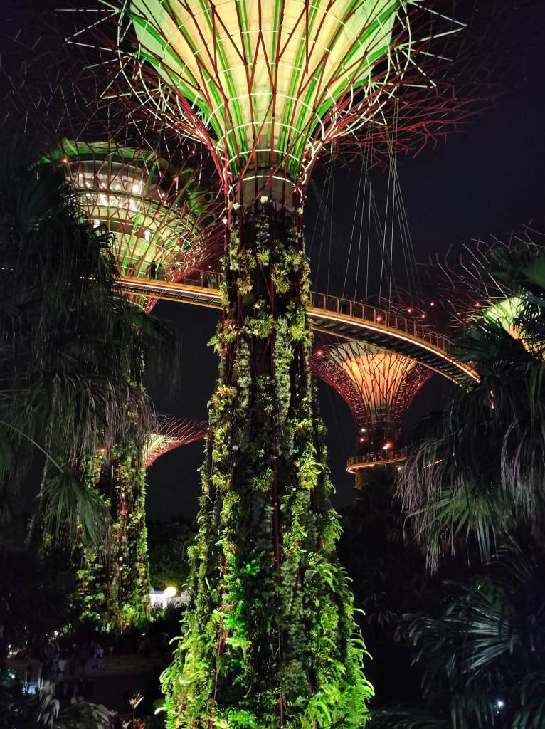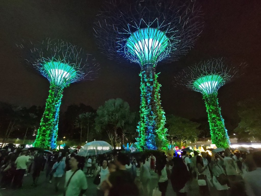 You can see the stunning Gardens by the Bay. I’ve really never seen anything so lovely. Visiting the light show by night (7pm), known as “Garden Rhapsody” was wonderful. It puts Barcelona’s magic fountain to shame. And guess what, it’s free! Whilst we were there, it was raining gently, only adding to the moving atmosphere.