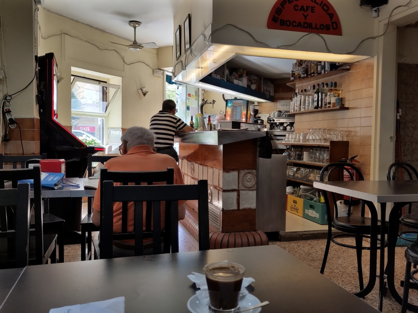 I slurped my coffee and looked around. There were just three people plus myself. The old man, sat at his table alone, reading the newspaper. Another one scrolling aimlessly through his phone whilst sat the bar, and another guy on the slot machines. Occasional slot machine jingles floated around.